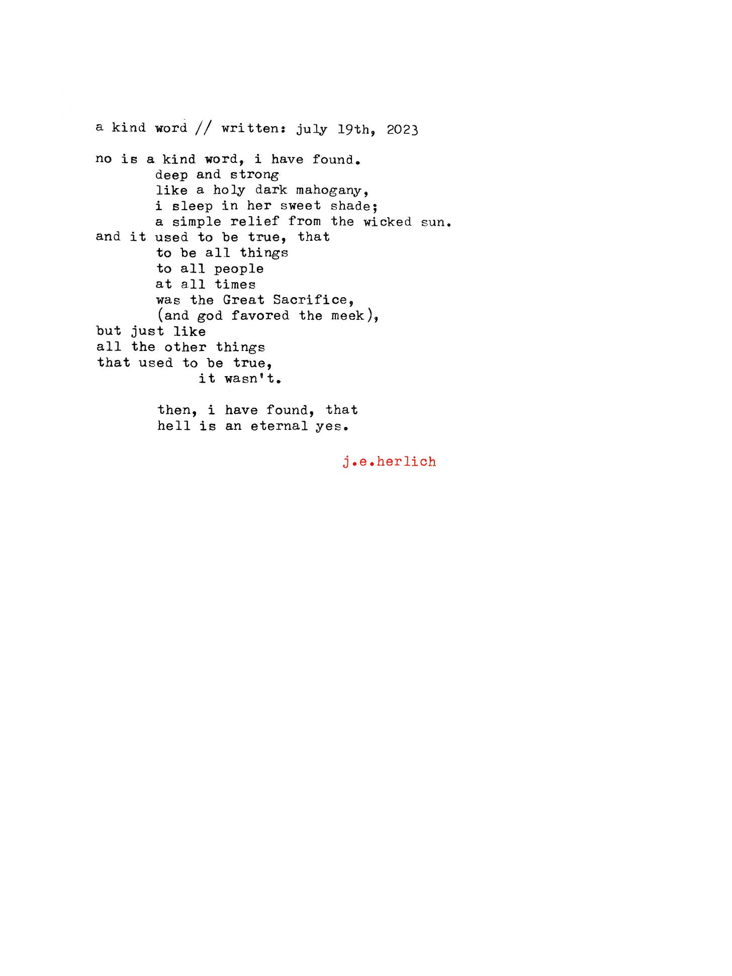 a kind wordthen, i have found, that hell is an eternal yes.j.e. herlichAug 12, 2025Sharethis substack is reader-supported. to receive new posts and support my work, consider becoming a free or paid subscriber.Subscribe